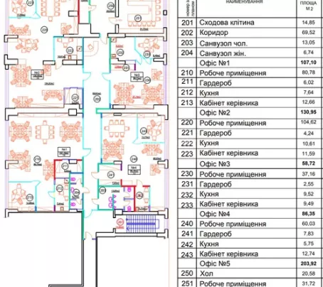 - Планировка: 1 кабинет Open space, 2 отдельных кабинета, переговорная, 1 кухня, 4 с/у, душевая комната.