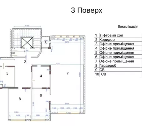 - Кожен поверх зонований під офіс площею від 220 до 260 м²