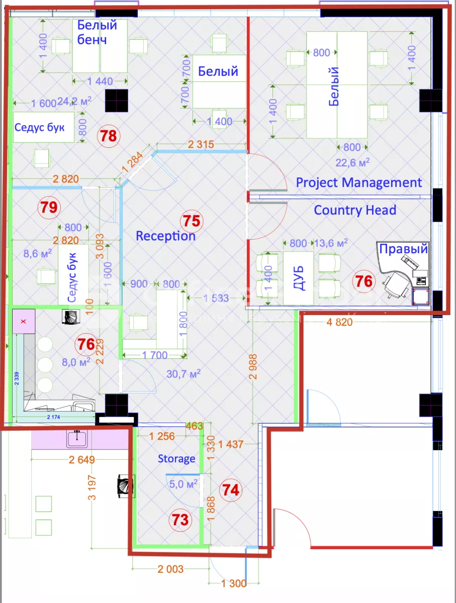 - Планування: 3 окремих кабінети, 1 переговорна кімната, кухня, 2, хол ресепшен, 1 санвузол.
